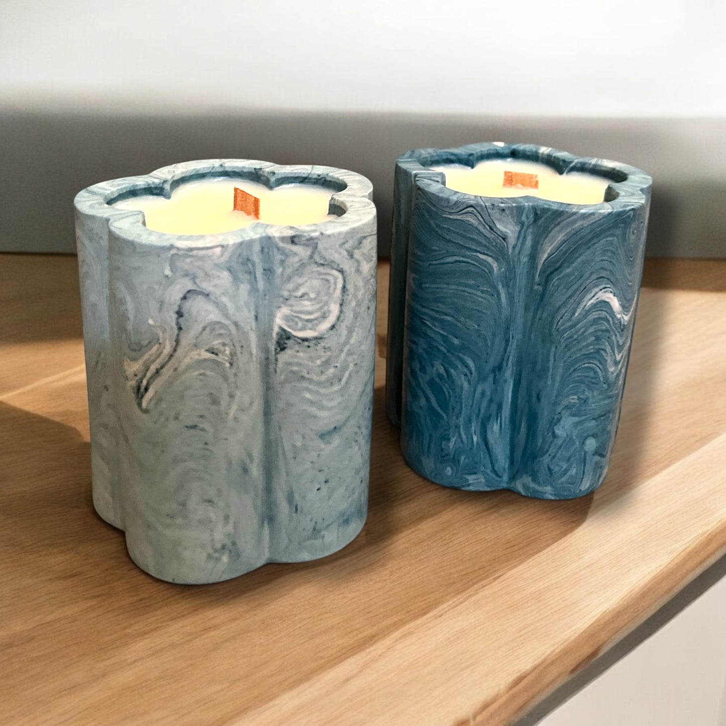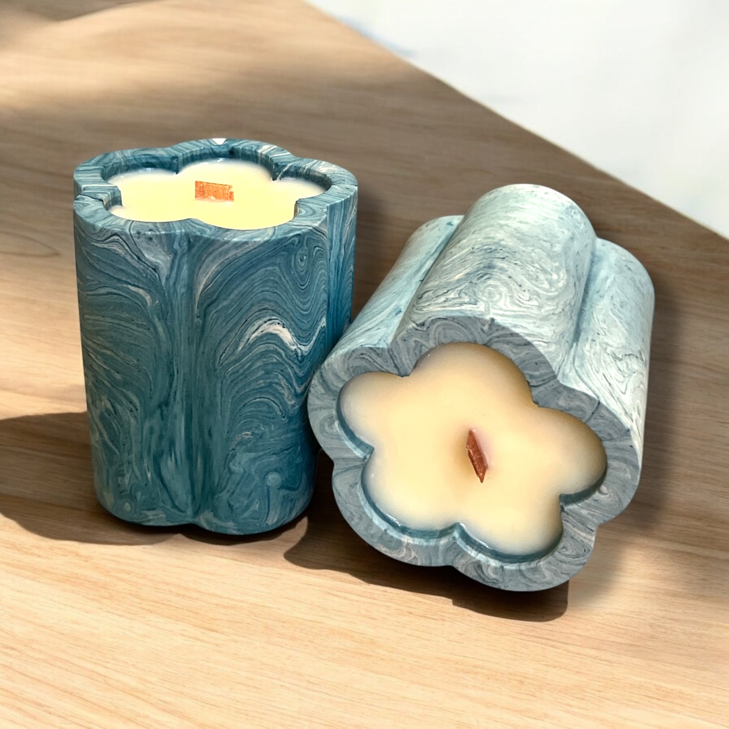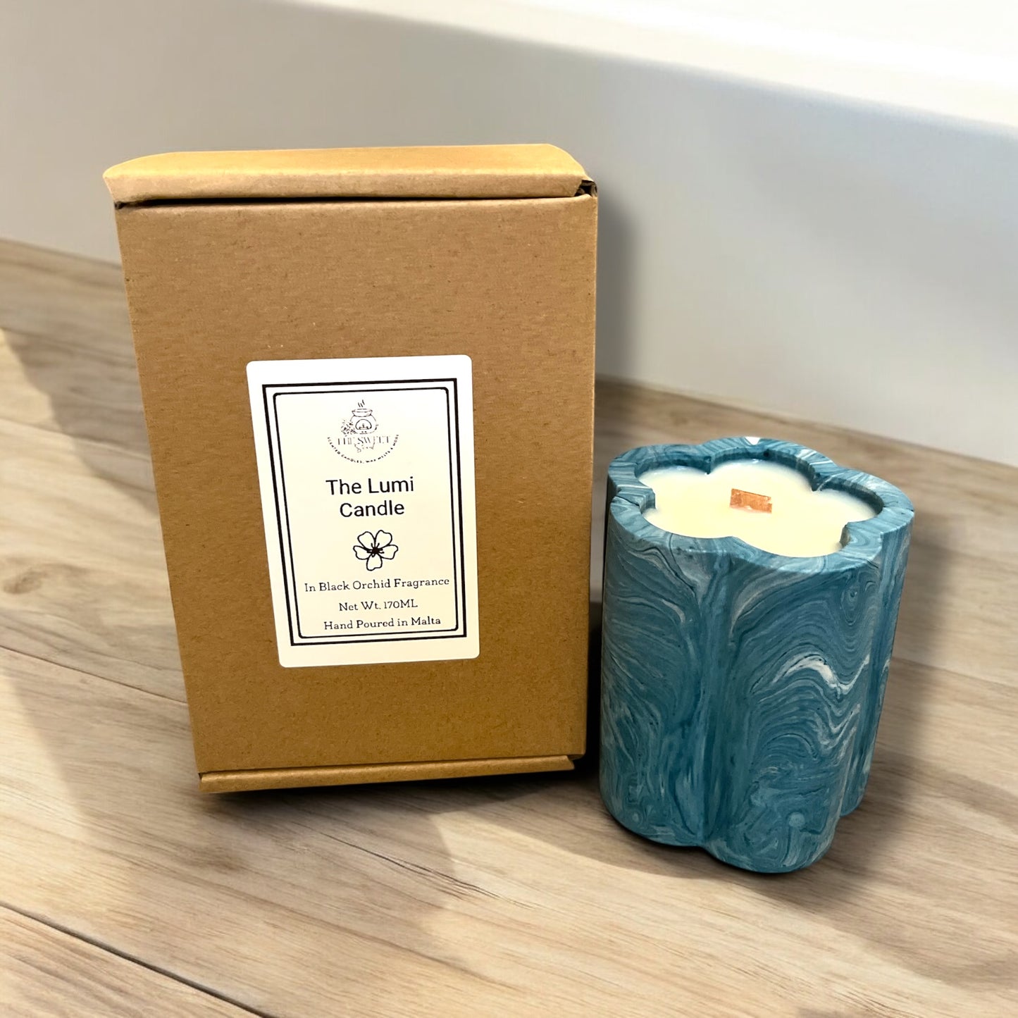 Experience the luxurious ambiance of The Lumi Candle, expertly crafted with 170ml of soy wax and infused with the fragrant essence of Black Orchid. The sleek design features a sustainable concrete blue and white marble effect, with a unique wood wick. Packaged in a presentable kraft box, this candle makes the perfect gift.